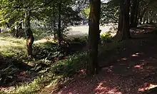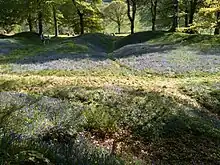 Blackbury Camp sits on an east to west ridge overlooking valleys formed by tributaries of the River Coly,[1] some 185 metres (607 ft) above sea level.[3] The camp consists of an oval enclosure, around 200 metres (660 ft) long and 100 metres (330 ft) wide, which is surrounded by a rampart 3 metres (9.8 ft) high and up to 10 metres (33 ft) wide.[4] The rampart was built from clay and flint quarried from a surrounding outer ditch which is up to 12 metres (39 ft) wide.[4] Today the ditch contains up to 2 metres (6.6 ft) of silt, so the earthworks would have looked more imposing with a deeper ditch when they were built.[5]