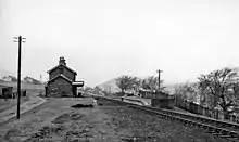 The platform was approached from the main road by a steep footpath and the two platforms were joined by a barrow crossing. The platform contained a sizeable waiting room, and a notably tall signal box. The waiting room was fronted by blue diamond-cut setts rather than ash, whilst the area in front of the signal box was clad with wooden planks overlaying a cavity through which the rods and wires were channelled.