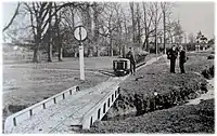 The main line was used from 1942 to about 1944 with manually pushed V-skip trucks to transport coke to the estate's power plant. Around 1946, the remnants of the line were dismantled and the trucks scrapped. When Sarah, the second wife of Charles William Bartholomew, with whom he had the children Ivy and James, moved to her son's house in Norfolk in 1947, the furniture and other contents of the manor house were auctioned off. The property was initially sold to the Hesketh family in 1949, but subsequently changed ownership several times. Sarah died in 1953 at the age of 89 years.[2] After Blakesley Hall had fallen into disrepair for over ten years, it was demolished in 1957.[1]