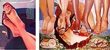 In 2000, Andrea Blanch, a veteran fashion photographer whose work had been published in many magazines and books of her own, was commissioned by Allure magazine to take pictures that would illustrate an article about glittery nail polish. While the magazine's creative director suggested the model to use, the brand of nail polish and the jewel-encrusted silk Gucci sandals she wore, Blanch chose the camera and film and lit the scene based on her years of experience. She came up with the idea to pose the model's feet, her legs crossed, on a man's legs in an airplane seat, to give it a slightly erotic sensibility. A picture of the model's feet in tight closeup was used in the magazine's July issue of that year; Blanch was paid US$750[23] ($1,300 in 2022[24]).