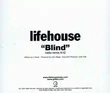 "Blind" is a song by American alternative rock band Lifehouse. The song was released in November 2005 as the second radio single in support of the band's third studio album, Lifehouse. The single failed to make a huge impact at radio, peaking only at #22 on Billboard's Adult Top 40 chart.