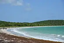 Blue Beach, better known as La Chiva Beach (Spanish: Playa La Chiva), is a popular beach on the southern coast of Vieques in barrio Puerto Ferro. The beach is considered one of the best in both Vieques and Puerto Rico for its breathtaking scenery, its soft sand and crystal clear water, ideal for swimming and snorkeling.[1][2][3] The beach is known as La Chiva Beach by locals, and its English name originated as a nickname that was given to it by members of the US Navy.[4] The area was formerly used by the Navy but it has been declared safe for visitors; however, beachgoers are prohibited from entering La Chiva Key due to the risk of unexploded ordnance.[4] The beach was closed for a time after the destruction caused by Hurricane Irma in 2017 but it reopened the next year.[5]