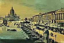 The Blue Bridge (Russian: Си́ний мост, Siniy most) is a 97.3-metre-wide (319 ft) bridge that spans the Moika River in Saint Petersburg, Russia. The Blue Bridge is the widest bridge in Saint Petersburg and is sometimes claimed to be the widest bridge in the world – a claim, however, that has not been recognized by international reference works, such as the Guinness World Records.