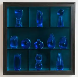 Blue Prism Painting I is a sculpture created by Josiah McElheny in 2014. Crafted out of blue glass, mirror, oak, and plywood, this sculpture is the first installment of his blue prism series, crafted from 2014-2015. Blue Prism Painting I features 11 blue glass shapes, set on blue mirrored shelves in a wooden box frame. It was purchased in 2014 as a part of the permanent collection for the Memorial Art Galley in Rochester, New York.[1]