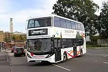 The QuayConnect shuttle service runs a service around the city of Southampton, stopping at Southampton Central railway station, Westquay Shopping Centre and Town Quay, for the Hythe Ferry and the Red Funnel ferries to the Isle of Wight.[28] The service was started as City-Link, under the previous operator, Enterprise, but the operation was taken over by Bluestar on 28 September 2008. The first two buses used on the service were Dennis Darts inherited from Enterprise, and were repainted in a new two-tone blue livery with the interiors re branded. In May 2016 the service was re-branded as QuayConnect with a new red and white livery featuring the newest Red Jet which came into service for Red Funnel shortly after. Originally the service was free to use for all passengers, but a change in May 2014 saw fares introduced for all except Red Funnel ticket holders. The frequency of the service was also cut down to every 30 minutes, but with a duplicate bus running on some morning services and a 15-minute frequency between 4-7pm, or when local events take place in Southampton or the Isle of Wight, such as Cowes Week or Bestival.[29] The service was upgraded with an Alexander Dennis Enviro400 City in November 2018.[30]