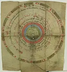 Latin 7478 consists of 17 folded leaves, perhaps previously attached to the tabs, but throughout the manuscript conservation it has obtained a new binding more like a traditional codex. It follows the pattern similar to what Johan Peter Gumbert calls H6r pattern: with the leaves opening on the top as well, then the first compartment unfolding the right, and only the last one on the left.[5][6] Latin 7478 has been copied by Paul of Kignin (could be also read as Szignin), whose autograph is found on folio 15, alongside with the supposed date of the manuscript production: 1456. The identity of the scribe remains to be investigated. However, some of the scholars presume that at least two people have been involved in the production of Latin 7478: a rather skilled almanac-maker, able to abbreviate diagrams and tables with a minimal loss of information, and a less experienced scribe, able to adapt 19-years cycles to a required date, lacking the knowledge to perform this procedure without distorting the time of syzygies.[7]