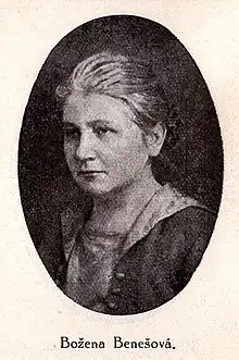 Božena Benešová, née Zapletalová (30 November 1873 – 8 April 1936), was a Czech author and poet whose work is considered to have been at the forefront of psychological prose. The greater part of her youth was spent in Uherské Hradiště and Napajedla, where in 1896 she married a railway clerk named Josef Beneš. In 1908 she and her husband moved to Prague.