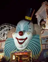 The hotel rejoined the Holiday Inn chain through a new franchise deal later in 1994,[30] and a Coney Island theme was added shortly thereafter.[31] A carnival facade was built in 1995, adding non-functional replicas of a parachute drop, roller coaster, and Ferris wheel, as well as a giant clown face and retail shops.[31][32][33][34] The casino was also expanded,[35] and a 15-floor, 451-room tower was finished in 1996.[32][36] That year, Jacobs Entertainment, Inc. made a $9 million investment in the Boardwalk.[37] In 1997, the resort added the 370-seat Surf Buffet,[38] which ran a television commercial starring professional boxer Butterbean.[39][32][40]