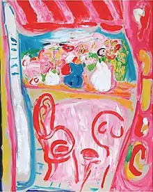 At the Art Students League, Kane studied with George Grosz, and with Will Barnet, who became one of his greatest influences.[1]:25 Barnet’s class was where Kane met Belgian student Eva Marie Honigman in 1961, whom he married three years later.[1]:53 [3] Her work as a textile designer,[3] with its bold sense of color and design, inspired him. “She is by far the greatest influence on me," Kane said. "When I first met her, her French feeling for gaiety impressed me and has become a major part of my work.”[1]:40