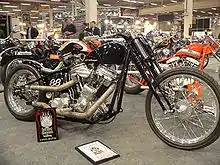 Immediately after World War II, bob-jobs, in parallel with hot rods, were subject to increasingly decorative modifications, including extra chrome plating, metal flake paint jobs, pin striping, and colored upholstery. As early as 1946, Kenneth Howard ('Von Dutch') began modifying his Indian Scout bob-job with wild paint jobs, a smaller gas tank, raised handlebars, and exhaust pipes which turned upwards at the rear.[5] Such modifications became the standard for bob-jobs, which grew in popularity, whether as show bikes [6] or ordinary road bikes. The bob-job evolved through the 1950s and 60s in several directions; some were strictly for the popular motorcycle and hot rod show circuit, some had a distinctive 'club bike' style, some reflected drag racing practice, and some were simply a continuation of the original Class C inspiration.