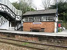 The former signal box, which now houses a cafe, is situated to the north-east of the booking office, with the footbridge lying beyond this. The signal box is a Great Western Railway Type 3 structure dating from 1887 with stairs in two different styles. It was designated as a Grade II listed building in 2015.[16]