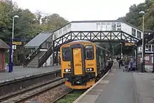 The brick-built Great Western Railway booking office is next to the entrance on the westbound platform, while a matching building on the opposite platform serves as a waiting room for passengers travelling towards Plymouth.