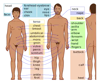 The human body has a head, neck, torso, two arms, two legs and the genitals of the groin, which differ between males and females.