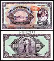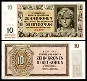 Czechoslovak banknotes for 1 koruna and 5 korun were stamped (and later printed) with "Protektorat Böhmen und Mähren" over "Protektorát Čechy a Morava," and subsequently issued in Bohemia and Moravia beginning on February 9, 1940.[8] These were followed by regular government issues of 1, 5, 50 and 100 korun in 1940,[9] 10 korun in 1942,[10] and 20 and 50 korun in 1944.[11] Nationalbank für Böhmen und Mähren in Prag (National Bank for Bohemia and Moravia in Prague) introduced 500 and 100 korun notes in 1942, followed in 1943 by overprinted Czechoslovak 5000 korun notes. In 1944, the National Bank issued regular 5000 korun notes.[11]