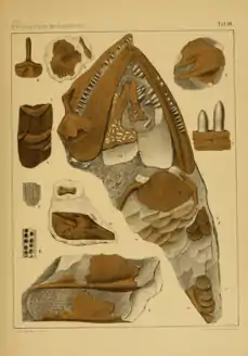 | The crushed skull of Boii, showing impressions (grey) and the underside of preserved bones (yellow) illustrated along with other tetrapod fragments by Frič (1883) | |
