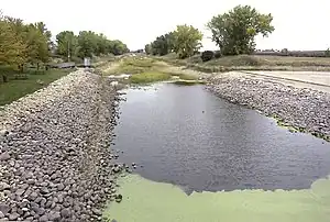 ![]() The Bois de Sioux River below the dam of Lake Traverse. Roberts County, South Dakota is at left, and Traverse County, Minnesota is at right. | |
