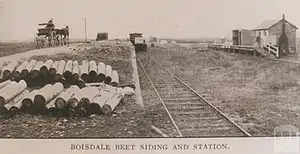 The station opened concurrently with the Briagolong railway line in 1889, and was 224 km from Southern Cross.[1][2] The main items freighted at the station were sugar beet and firewood.[3] In 1902, a farmer named John Bennett fell off the platform at the station onto the rails, breaking two of his ribs. Bennett ultimately was compensated by the Railway Department with a "substantial settlement".[4][5]