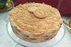 The biscuits used for a layer are briefly soaked in strong coffee or espresso and arranged in a dish or pan.[8] It is then applied with thin layer of buttercream.[9] Then next layers of biscuit and buttercream are repeated until reaching the desired height.[10] The sides are also frosted and sometimes coated with biscuit crumbs then chilled for it to set.[11] In Brazil, it is sometimes coated with a chocolate brigadeiro-like ganache.[12]