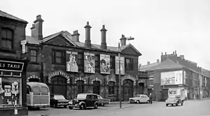 Originally named Bolton, it was renamed Bolton Great Moor Street in October 1849.[4][5] The original street level station was replaced by a temporary station at Bolton Crook Street Goods Yard on 1 August 1871 while the new station was built in a classic Italian style. It opened either on 1 April 1875[4] or on 28 September 1874 on the same site as the original station but at a higher level. The rebuilt station had four platforms covered by a roof.[6] Its reconstruction coincided with the building of the direct line to Manchester Exchange via Walkden Low Level by the London and North Western Railway which opened on 1 April 1875.