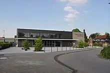 Burgwiesenhalle, kindergarten (right) and church (background)