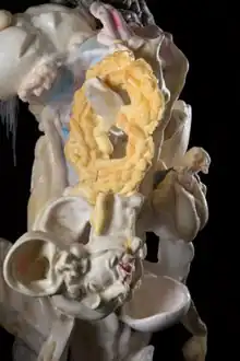 Collura emerged in the later 1990s among artists responding to such issues as the disavowal of referentiality and narrative by modernism, postmodern information overload, and the collapse of various universal distinctions (e.g., organism and machine, human and animal).[7][22][32] Her work has often been described as "hybrid," fitting disparate physical and conceptual elements, processes, references and signifiers into uneasy wholes.[13][33][7] She employs recognizable elements of classic pre-modernist statuary (such as expressive poses and gesture), while challenging that tradition through unconventional construction techniques and fusions of abstract and organic form.[13][5][6] Her method has been described as a "shuffled deck" of images and meanings[33] crossing centuries, aesthetic inspirations (the religious, erotic baroque of Bernini, Disney animation, the grotesque) and cultural sources (mythical, Biblical and religious stories, classic Hollywood movies).[2][9][1][34]