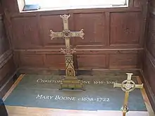 Both Christopher Boone (1616-1686) and his wife, Mary (c1638-1722) are interred within the chapel.