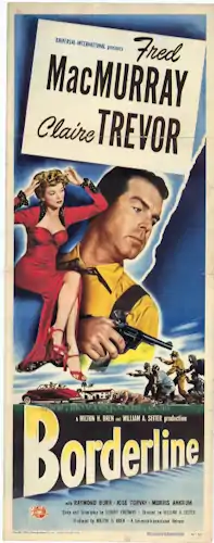 Borderline is a 1950 American crime film noir directed by William A. Seiter and starring Fred MacMurray and Claire Trevor. It was filmed from late May to early July 1949 at Republic Studios.[2]