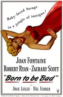 Born to Be Bad is a 1950 American film noir melodrama directed by Nicholas Ray and starring Joan Fontaine, Robert Ryan and Zachary Scott. It features Fontaine as a manipulative young woman who will stop at nothing to get what she wants. It is based on the bestselling novel All Kneeling by Anne Parrish (1928).[2]