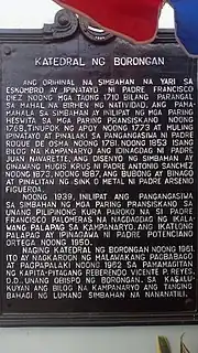 Father Francisco Diez built the original church in 1710 in honor of the Blessed Virgin of Nativity. Franciscan priests transferred the church administration in 1768 to the Jesuits. In 1773, it was consumed by fire. It was rebuilt and enlarged under the direction of Father Roque de Osma in 1781. A round bell tower was added in 1853 by Father Juan Navarette. The design of the church was made in the shape of a cross by Father Antonio Sanchez in 1873. In 1887, Father Arsenio Figueroa changed the roof and was replaced with a sink or metal. In 1939, Franciscan priests transferred the administration of the church to its first Filipino parish priest, Father Francisco Palomeras, who added a second floor to the bell tower. In 1950, the third floor was built by Padre Potenciano Ortega.