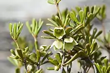 Boronia octandra is a shrub that grows to a height of 30 cm (12 in) with its young stems covered with short, soft hairs. The leaves are trifoliate and each leaflet is more or less cylindrical to club-shaped and about 5 mm (0.20 in) long. The flowers are borne singly in leaf axils and are greenish cream to yellowish brown on a top-shaped pedicel about 2 mm (0.079 in) long. The four sepals are egg-shaped, about 3 mm (0.1 in) long and the four petals are broadly elliptic and about 8 mm (0.3 in) long. The eight stamens are all fertile and alternate in length with those adjacent to the petals shorter than those adjacent to the sepals. Flowering occurs from June to October.[2][3]