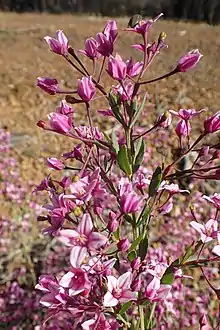 Boronia tenuior is an open, glabrous shrub that typically grows to a height of 1–2 m (3 ft 3 in – 6 ft 7 in). The branchlets are more or less square in outline with a narrow, wavy, glandular wing on each corner. It has simple, elliptic leaves, 10–20 mm (0.39–0.79 in) long with serrated edges. The flowers are arranged in cymes on the ends of the branchlets with large, red bracts at the base. The flowers on the edges of the cymes are borne on a thin, dark red pedicel 7–20 mm (0.28–0.79 in) long. The four sepals are dark red, narrow triangular to egg-shaped and about 2.5 mm (0.098 in) long. The four petals are pink to mauve, darker in the centre and about 6 mm (0.24 in) long. There are eight stamens with a warty tip and hairy. Flowering mainly occurs between October and January.[2][3]