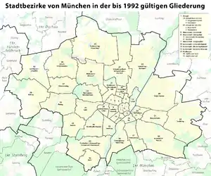 Since the administrative reform in 1992, Munich (German: München) has been divided into 25 boroughs or Stadtbezirke: