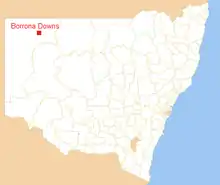 Borrona Downs Station is a cattle station near White Cliffs in far western New South Wales, Australia.[1][2][3] It is about halfway between Milparinka, around 100 km to the West, and Wanaaring, around 100 km to the East, as the crow flies.[2]