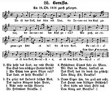 In 1814, King Friedrich Wilhelm III met the Italian composer Gasparo Luigi Pacifico Spontini in Paris, whom he brought to Berlin in 1820 as a music director. One of Spontini's first Berlin works was the composition with the title Borussia. It had already been composed by him two years ago as Chant National Prussien. He instrumented it with 100 violins, 50 trumpets, twenty other wind instruments (e.g. Bassoon, clarinet, horn) and 130 voices along with a soprano solo. It incorporated the melody of the British anthem God Save The Queen.[2][3] The text was written by Johann Friedrich Leopold Duncker the cabinet secretary of the king.[4]