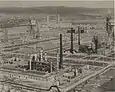 The petrochemical plant was built in four stages: First stage (1952-1960), comprises the first works from the Borzești Thermal Power Plant (1952), the No. 10 Oil Refinery[12] (by H.C.M .1683/1952[13]), the Rubber Plant (H.C.M. 1498/1957[14]) grouped on 610 ha; (1961-1965), the phenol, acetone equipments (1961), synthetic rubber (1963) and styrene-polystyrene (1964), the industrial platform exceeds 846 ha. In the third stage (1966-1970), works were started at Refinery II and the Poly-isoprenic factory. In the fourth stage, two industrial objectives were put into operation: Synthetic Rubber Plant II and Refinery II. The surface of the platform has exceeded 1000 hectares and includes the city platform based on the food industry, wood processing and others.[12]