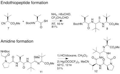 In 2012, an alternative synthesis of the bottromycin macrocyclic ring system and amidine linkage was reported.[19] The synthesis was achieved in 10 steps. Unlike the previous synthesis, Ackerman and colleagues synthesized a linear peptide and achieved intramolecular amidine formation using an S-methylated endothiopeptide. The endothiopeptide was obtained by a thio-Ugi reaction. The resulting macrocycle was obtained as a racemic mixture at the amidine linkage. The full synthetic scheme may be viewed under the collapsed synthetic scheme link.