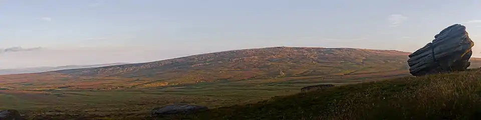 The underlying rock is Millstone Grit, which is seen outcropping in several places[4] and forming a steep scarp face along the summit.[5] The hill is covered by acidic grassland,[6] which provide a valuable breeding ground for red grouse, twite,[5] golden plover[5] and other birds.