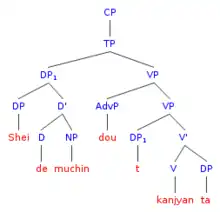 If a pronoun has a quantified expression as antecedent, the pronoun must be c-commanded by this antecedent.[3][4] An antecedent c-commands a pronoun if, when observing the structure of the sentence, a sister of the antecedent dominates the pronoun.[5]