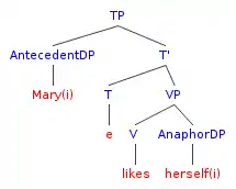The way a DP can bind given this domain depends on the kind of that DP that is being bound. Anaphors (reflexives pronouns like herself and reciprocals like each other) must be bound in their domain, meaning they must have a c-commanding antecedent in their domain. Pronouns (such as she or he) must not be bound in their domain, meaning they cannot have a c-commanding antecedent in their domain. Finally, R-expressions (such as proper names, descriptions, or epithets) must not be bound, meaning they must not have a c-commanding antecedent at all.[8]