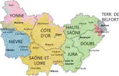 Bourgogne-Franche-Comté comprises eight departments: Côte-d'Or, Doubs, Jura, Nièvre, Haute-Saône, Saône-et-Loire, Yonne, Territoire de Belfort.