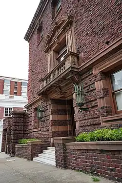 The Bourn Mansion exterior looks like an English townhouse with red clinker bricks and dramatic chimneys; and the interior was designed with a traditional formalist style, very heavy and dark.[3] The building has 28 rooms and 14 fireplaces.[6]