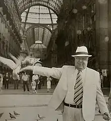 Sheikh Boutros el-Khoury in front of the Galleria Vittorio Emanuele II in Milan wearing a Borsalino hat instead of his favorite tarboush.