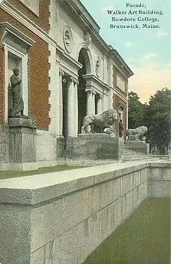 The Museum’s landmark Walker Art Building was commissioned for the College by Harriet and Sophia Walker in honor of their uncle, a Boston businessman who had supported the creation of the first small art gallery at Bowdoin in the mid-nineteenth century. Designed by Charles Follen McKim of McKim, Mead, & White, the building was completed in 1894 and is on the National Register of Historic Places.[1] [2] At the entrance are a pair of Medici lion sculptures.