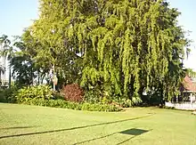 The northern lawns segment extends from the O'Connell Terrace edge across the park to the impressive edge formed by the fig trees (Ficus benjamina) and associated exuberant planting and from Bowen Bridge Road to the eastern pedestrian entry. A set of Brisbane tuff stairs ascends from O'Connell Terrace at the north-west corner to a now open level lawn area which was the site of the Superintendent's cottage from 1914 to 1949. It was later established as a series of circular ornamental beds planted with annuals and surrounded by hedging under Oakman's management. The lawn area is edged by the early plantings of leopard (Caesalpinja ferrea), bauhinia (Bauhinia hookeri), flame (Brachychiton acerifolium) and fig (Ficus microcarpa var. Hillii) trees with their associated underplanting that frame the north entrance off Bowen Bridge Road. The central sloping lawn is bisected by a path and planted randomly with a variety of palms. Many of the palms are plantings from the early twentieth century. This portion of the park, formerly containing the glasshouse, cottage and associated nursery activities, served as a separate area to the primary display and recreation areas of the QAS Gardens and the Brisbane Municipal Council's 1914 redevelopment. The Figs (Ficus benjamina) and associated understorey planting may have served as a separation between the areas.[1]