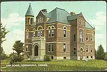 The original Bowmanville High School was built and opened in 1890.[4] It was located closer to downtown Bowmanville on Queen Street, at the end of Division Street south. In 1929, the high school was expanded upon with a new section. Another section was added in 1954. In 1972, the high school moved to its current location on Liberty Street, leaving the original building empty.[3] In 1974, a fire destroyed much of the school, including the roof and original 1890 section, leaving only the 1920s and 1950s additions standing.[5]