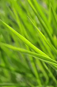 Brachiaria are annual or perennial grasses, most lacking rhizomes. The inflorescence is a branching panicle, and the plant reaches about a meter in height.[9] The plants are bisexual[9] and the flowers are fleshy, with 3 anthers.[10] Some species have a prominent vein in the center of the leaf.[9] Brachiaria are C4 species and can tolerate drier conditions and more light exposure than some other plants.[9]