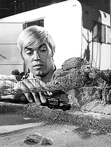 Dennis Cole as Davey Evans plans a stunt by playing with a model