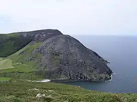 The path to the summit from Bradda West is part of the Raad ny Foillan, the Isle of Man Coast long distance footpath. Cliffs drop from the summit down to the sea. It shelters Fleshwick Bay from the west. A gorse fire in October 2003 took two days to control, five days to die, and scarred Bradda Hill and other headlands around Fleshwick.
