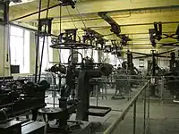 Here is machinery from the 19th century Industrial Revolution, including waterwheels, steam engines, oil engines and gas engines; plus an engineer's workshop display.[4] The millstone is from Castlefields corn mill near Bingley; it is a bedstone carved from local millstone grit.[5] A spindle passes through this and a similar upper runner stone; the grain enters via the spindle hole and is ground by the scissor-action of the grooves when the runner stone rotates against the bedstone. The grain is forced out at the outer edges as flour, then flows into a sack.[6] The prime exhibit, a uniflow steam engine rescued from Linton mill and known as the Linton engine,[7] was one of the last Bradford-made steam engines. There is a display explaining the history of steam power.[4]