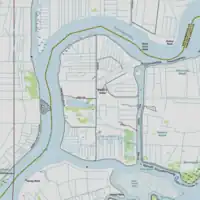 Bradford Island is an unincorporated area near the northeast corner of Contra Costa County,[157] in Supervisorial District III[158] and census tract 3010.[159]:305 It is not part of any public healthcare service district,[160]:9 mosquito abatement district,[12]:41 municipal water district, or wastewater district.[161]:18 is located in the Byron Brentwood Knightsen Union Cemetery District.[162]:246 It consists of 64 parcels, all of which are zoned for agricultural use; the majority are zoned A-2, and two large parcels on the north side of the island are zoned A-4.[157][163] Its law enforcement jurisdiction is designated PSA-6 (county-wide police protection pervices);[164]:41 a municipal service review of law enforcement noted that Bradford Island and the Webb Tract were the only areas of the county identified as "difficult to serve", since they are only accessible via the ferry from Jersey Island.[164]:306
